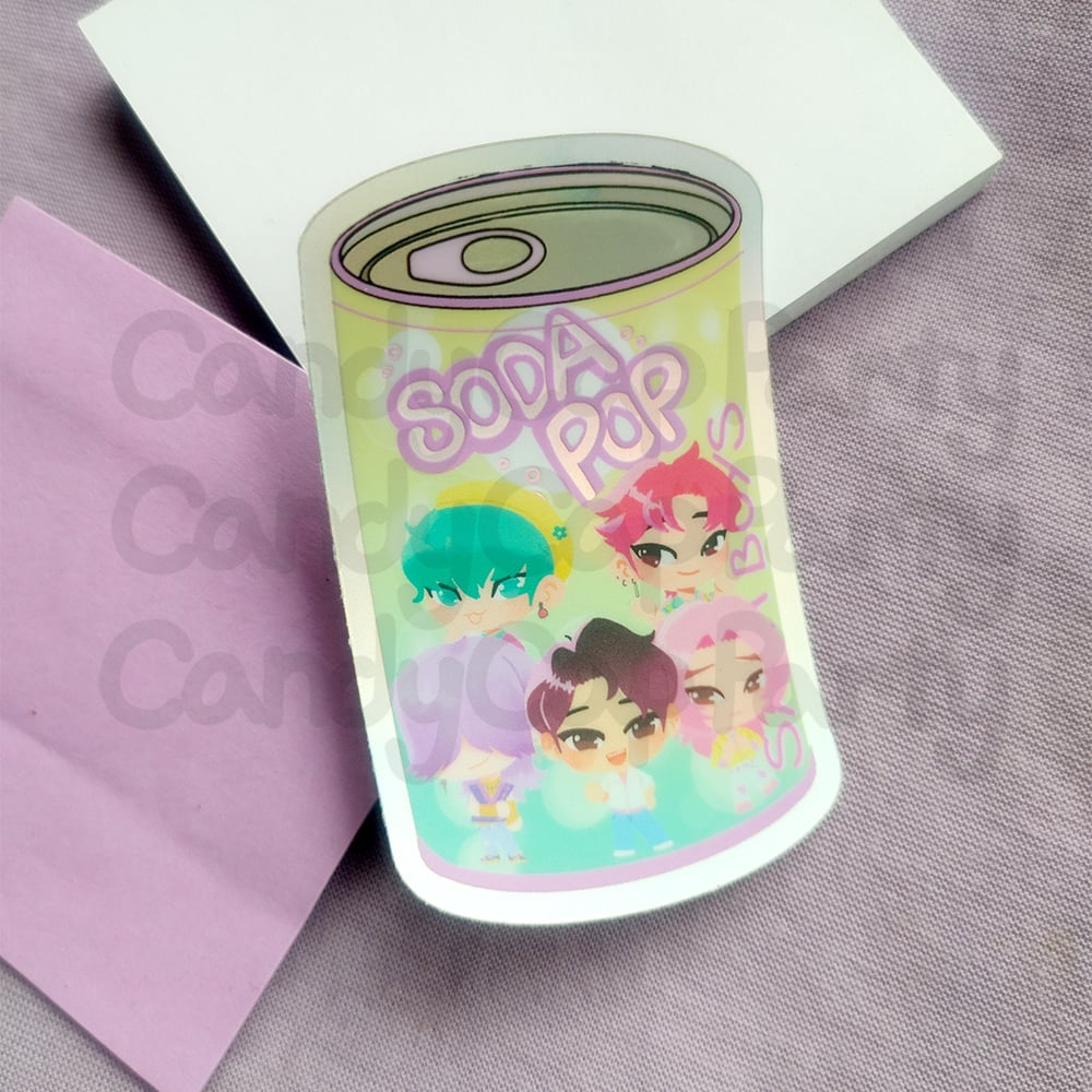 holographic sticker featuring those cute KPOP boys and their soda pop song! This sticker is meant to look like a can of soda, and has a holo metal effect.